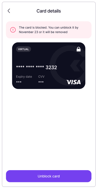 Click the Unblock card button: