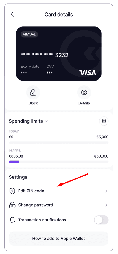 In the Settings section, click the Edit Pin code button: