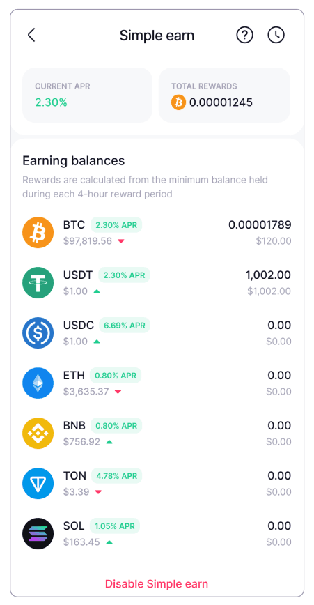 Simple Earn lets your crypto assets earn rewards while they remain in your account.
